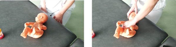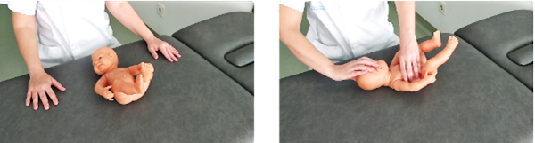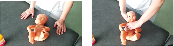 El bebé mira hacia la derecha. Llevamos la barbilla del bebé hacia el hombro izquierdo. Mantenemos unos segundos y volvemos a la posición inicial.