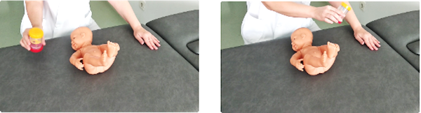 Con el bebé boca arriba, intentamos que gire la cabeza hacia la izquierda con estímulos sonoros y visuales.