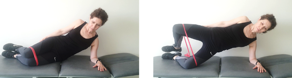 Tumbados de lado con las piernas dobladas y una banda elástica por encima de las rodillas, los pies juntos y el codo doblado a la altura del hombro, elevaremos el tronco manteniendo la alineación de hombros y caderas a la vez que separamos las rodillas sin despegar los talones. Mantenemos 5 segundos y volvemos despacio a la posición de reposo.