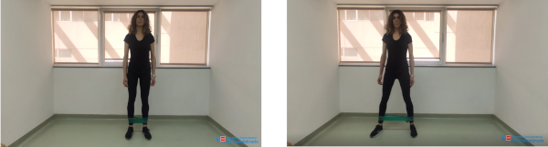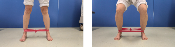 De pie, con los pies separados el ancho de las caderas. Colocamos una banda elástica entre ambos tobillos. El ejercicio consiste en bajar el cuerpo flexionando las rodillas sin perder la tensión en la banda elástica. Durante el ejercicio la planta del pie no debe modificar su apoyo, manteniendo el arco interno del pie.