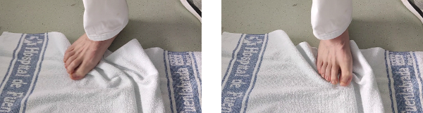 Sentado en una silla, con el pie apoyado sobre una toalla. Intentamos ir arrugando la toalla con los dedos del pie e incluso cogerla y levantarla del suelo.