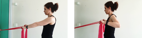 De pie, con banda elástica agarrada y sujeta al picaporte, partimos con los brazos paralelos al suelo a la altura de los hombros, tiramos de los brazos hacia atrás y hacia fuera doblando los codos, aguantamos 5 segundos y volvemos despacio a la posición de reposo.