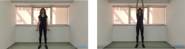 De pie, con la espalda recta y los hombros hacia atrás. Realizamos una flexión de codos y elevación de hombros subiendo las pesas por encima de la cabeza. A continuación bajamos los brazos y extendemos los codos volviendo a la posición inicial.