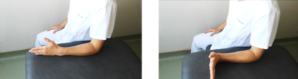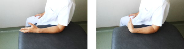 Sentados al lado de una mesa y con el codo y antebrazo apoyados sobre la misma. El pulgar mira hacia el techo. Llevamos la mano hacia atrás todo lo que podamos y volvemos lentamente a la posición inicial.