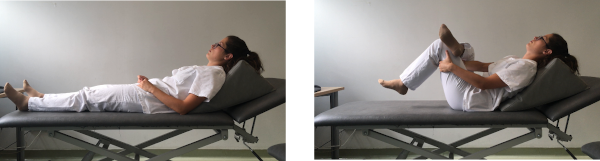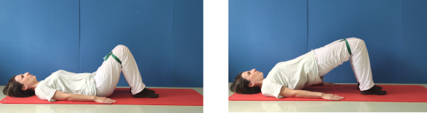 Tumbados boca arriba, con las piernas flexionadas y los pies alineados con las caderas. Colocamos una banda elástica entre las rodillas. Contraemos abdominales llevando el ombligo hacia el suelo. Manteniendo la contracción abdominal separamos ligeramente las rodillas para tensar la banda elástica. Elevamos la pelvis sin perder la tensión en la banda y aguantamos esta posición durante 3 segundos. Posteriormente volvemos a la posición de partida, sin relajar abdominales hasta que estemos totalmente apoyados en el suelo.
