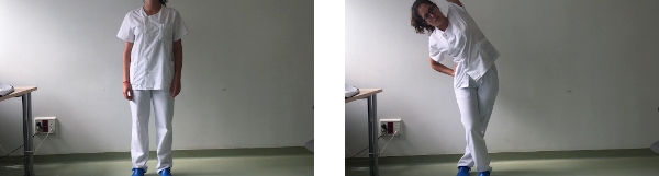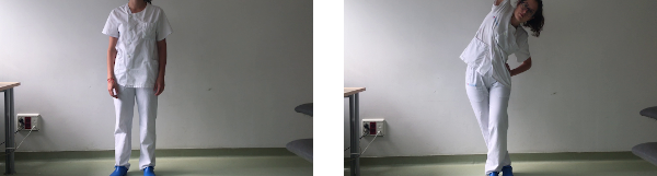 De pie, cruzamos la pierna izquierda por detrás de la derecha. A continuación nos inclinamos hacia el lado derecho, llevando el brazo izquierdo hacia el lado derecho. Se debe notar el estiramiento en la parte lateral de la pierna izquierda.