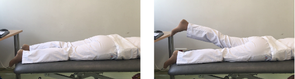 Tumbados boca abajo, elevamos la pierna a movilizar con la rodilla completamente extendida hacia el techo, mantenemos 5 segundos y la bajamos después muy lentamente hasta la posición inicial de reposo.