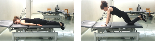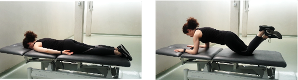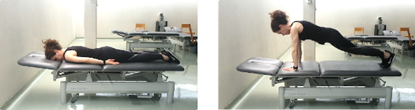 Nos colocamos boca abajo, apoyando las manos sobre el suelo con los codos estirados y a la altura de los hombros, elevamos el tronco y las caderas a la vez sin arquear la espalda, manteniendo las rodillas apoyadas en el suelo, y cruzando los pies que permanecerán elevados. Mantenemos 15 segundos. Respirar con normalidad.