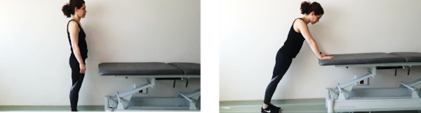De pie frente a la mesa, nos apoyamos sobre ella con las manos. Damos un paso atrás alejándonos de la mesa y echando el peso de nuestro cuerpo sobre las manos con los codos estirados, mantenemos 15 segundos. No doblar los codos y respirar con normalidad.