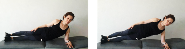 Tumbados de lado con las rodillas dobladas, los pies juntos y el codo doblado a la altura del hombro, elevaremos el tronco manteniendo la alineación de hombros y caderas. Mantenemos 15 segundos y volvemos despacio a la posición de reposo.