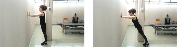 De pie frente a la pared, apoyaremos sobre ella las manos a la altura de los hombros. Damos un paso atrás alejándonos de la pared y echamos el peso de nuestro cuerpo sobre las manos con los codos estirados, mantenemos 15 segundos. No doblar los codos. Respirar con normalidad.