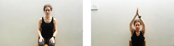 Sentados con las palmas de las manos juntas elevamos los brazos hasta la máxima amplitud. Aguantamos 5 segundos y volvemos despacio a la posición de reposo.
