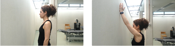 De pie frente a la pared, apoyaremos la mano sobre ella, elevaremos el brazo activamente deslizando la mano por la pared hasta la máxima altura que podamos alcanzar. Aguantaremos 5 segundos con el brazo elevado y bajamos despacio, llevando el brazo a la posición de descanso con la mano apoyada.