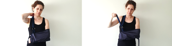 El cabestrillo debe cumplir la función de inmovilizar el brazo, pero se deberá retirar para el aseo y la realización de los ejercicios. Liberaremos primero la correa que sujeta el antebrazo al cuerpo y posteriormente la correa que sujeta el brazo al cuerpo dejando sujeto el extremo para que sea más fácil volver a ponérselo. Nos ayudaremos del brazo no afecto para el manejo del brazo inmovilizado. Para colocar de nuevo el cabestrillo, procederemos primero a colocar el cabestrillo, pasando la correa del brazo que lo sujeta al cuerpo por la cabeza y ajustaremos la tira, después procederemos a ajustar la tira que sujeta el antebrazo al cuerpo y acomodaremos el brazo.