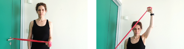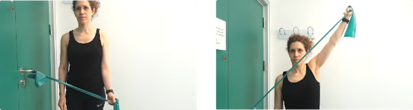 De pie con el codo doblado, con una banda elástica agarrada y sujeta al picaporte, hacemos rotación externa y manteniendo la tensión elevamos el brazo hasta la máxima amplitud, aguantamos 5 segundos y volvemos despacio a la posición de reposo.