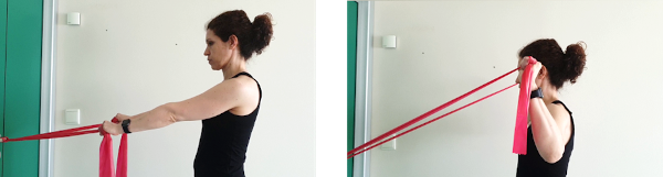 De pie, con una banda elástica por detrás de la espalda a la altura de las escápulas y sujeto con ambas manos y con los codos estirados empujamos con los hombros hacia delante, aguantamos 5 segundos y volemos despacio a la posición de reposo.