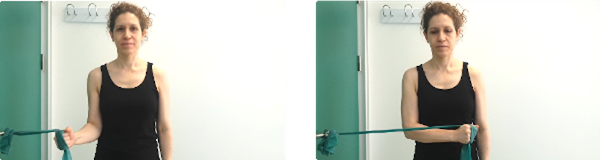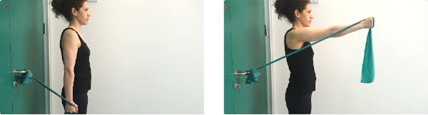De pie, con banda elástica agarrada y sujeta al picaporte, partimos con los brazos paralelos al suelo a la altura de los hombros, tiramos de los brazos hacia atrás y hacia fuera doblando los codos, manteniendo esta posición rotamos los brazos externamente elevando las manos, aguantamos 5 segundos y volvemos despacio a la posición de reposo.