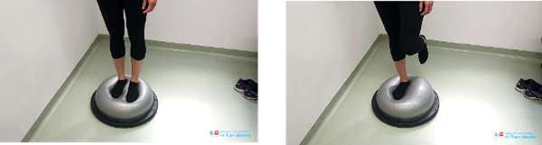 De pie sobre un bosu, intentamos quedarnos a la pata coja sobre el pie afecto y mantener el equilibrio. Si lo necesitamos, podemos apoyarnos con la mano del mismo lado en una pared. Si queremos dificultarlo un poco más, lo haremos sin el apoyo de mano.