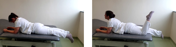 Tumbados boca abajo y con los codos flexionados y el tronco ligeramente elevado, en posición de "esfinge", doblamos la rodilla de la pierna afectada mientras extendemos el cuello; mantenemos esta posición 5 segundos. Después extendemos la pierna afectada a la vez que flexionamos el cuello y mantenemos 5 segundos en esa posición. Repetimos el ejercicio 10 veces seguidas.
