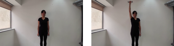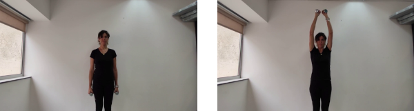 De pie, con la espalda recta y los hombros hacia atrás. Realizamos una flexión de codos y elevación de hombros subiendo las pesas por encima de la cabeza. A continuación bajamos los brazos y extendemos los codos volviendo a la posición inicial.