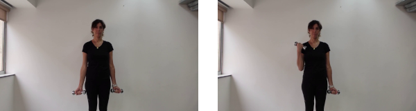 De pie, con una pesa en cada mano, de forma alternativa flexionamos un codo lentamente hasta completar todo el recorrido, manteniendo unos segundos en la máxima flexión y volviendo luego lentamente a la posición de partida. Realizamos el mismo ejercicio con el otro brazo. No lo hacemos con los dos brazos a la vez.
