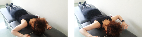 Boca abajo, con los brazos separados del cuerpo, los codos doblados, las palmas de las manos mirando hacia el suelo y a la altura de la cabeza, hacemos una retraccion de las escápulas y levantamos las manos de la superficie de apoyo. aguantamos 5 segundos y volvemos despacio a la posición de reposo.