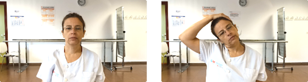 Sentados, con la espalda bien apoyada. Inclinamos la cabeza hacia un lado y nos ayudamos con la mano del mismo lado para aumentar ligeramente el estiramiento. Mantenemos 20 segundos y volvemos a la posición inicial. Posteriormente realizaremos el mismo ejercicio hacia el lado contrario.