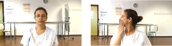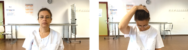 Sentados en una silla con el respaldo recto y la espalda apoyada, pies apoyados en el suelo y sin cruzar las piernas. Llevaremos la cabeza hacia atrás, sin bajar ni subir la barbilla. Podemos ayudarnos con las manos para llegar más atrás.