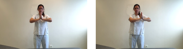 De pie, juntamos las palmas de las manos frente al pecho con los dedos mirando hacia arriba y los codos elevados casi a la altura de los hombros. Desde esta posición llevamos las dos manos juntas a derecha e izquierda alternativamente, manteniéndonos 5 segundos en cada lado. Repetimos este ejercicio 10 veces.