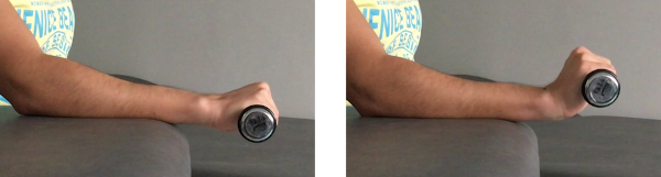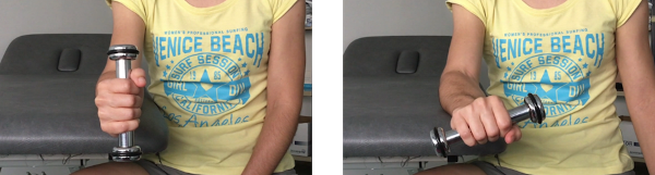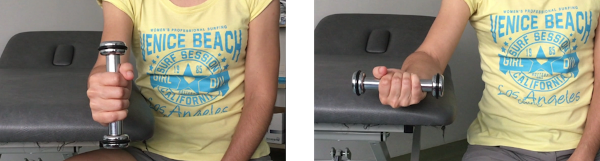 Sentados, al lado de una mesa y con el codo y el antebrazo apoyados sobre la misma y la mano por fuera con el pulgar mirando hacia el techo. Cogemos una pesa con la mano y giramos la pesa llevando la palma de la mano hacia el techo lo máximo posible. Después, volvemos a la posición inicial lentamente.
