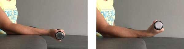 Sentados, al lado de una mesa y con el codo y el antebrazo apoyados sobre la misma y la mano por fuera con el pulgar mirando hacia el techo. Cogemos una pesa con la mano y giramos la pesa llevando la palma de la mano hacia el suelo lo máximo posible. Después, volvemos a la posición inicial lentamente.