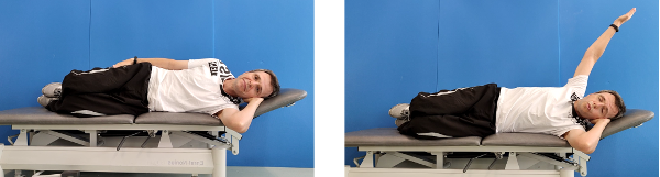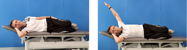 Tumbados sobre el lado izquierdo, con las piernas flexionadas y el brazo derecho a lo largo del cuerpo. Tomamos aire lentamente por la nariz al mismo tiempo que elevamos el brazo derecho lo que podamos. Posteriormente expulsamos lentamente el aire por la boca, con los labios fruncidos mientras el brazo derecho vuelve a la posición inicial.