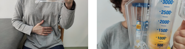 Sentados en una silla cómoda y con la espalda apoyada en el respaldo, tomanos el inspirómetro con una mano, mientras la otra la colocamos en el abdomen. Soltamos lentamente todo el aire y cuando ya no queda más aire en el interior de los pulmones, aplicamos los labios en la boquilla del inspirómetro y manteniéndolo vertical y a la altura de la boca, tomamos aire por la boca muy lentamente, llevando y manteniendo el indicador cuadrado hasta media altura. Seguimos tomando aire por la boca lentamente durante todo el tiempo que podamos.