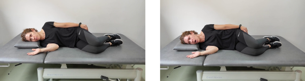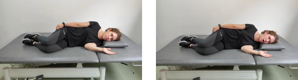Tumbados sobre el lado derecho, con las piernas flexionadas y el brazo izquierdo a lo largo del cuerpo. Tomamos aire lentamente por la nariz al mismo tiempo que elevamos el brazo izquierdo lo que podamos. Posteriormente expulsamos lentamente el aire por la boca, con los labios fruncidos mientras el brazo izquierdo vuelve a la posición inicial.