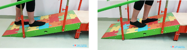 Caminaremos por una rampa, de forma lenta y controlada. Volveremos de espaldas, intentando que el pie quede pegado al suelo en toda su superficie.