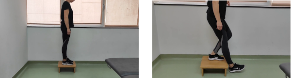 De pie, con un escalón delante. Subimos ambos pies, manteniendo una pierna apoyada, bajamos lentamente la otra hacia delante hasta tocar ligeramente el suelo con el talón del pie, dejando el peso del cuerpo en la pierna que se queda arriba pero doblando progresivamente la rodilla. Haciendo fuerza de empuje con la pierna de arriba, subimos el pie de nuevo al escalón. Las caderas deben estar estables, sin que se desplacen hacia los lados.