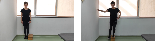 De pie, de lado en un escalón. Subimos ambos pies, manteniendo una pierna apoyada, bajamos lentamente la otra hacia un lado hasta tocar ligeramente el suelo con el talón del pie, dejando el peso del cuerpo en la pierna que se queda arriba pero doblando progresivamente la rodilla. Haciendo fuerza de empuje con la pierna de arriba, subimos el pie de nuevo al escalón. Las caderas deben estar estables, sin que se desplacen hacia los lados.