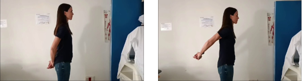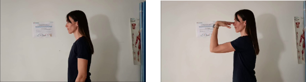 De pie, con los brazos a lo largo del cuerpo. Flexionamos el brazo afecto hasta la horizontal. Desde esa posición flexionamos el codo intentando tocarnos la nariz o la boca. Mantenemos la postura unos segundos y volvemos a la posición inicial.