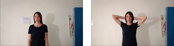 De pie, aunque también podemos hacerlo tumbados. Entrelazamos las manos y las ponemos tras la nuca. Si no es posible, intentaremos llevarla lo más cerca posible de la nuca. Llevaremos los codos tan atrás como nos sea posible sin que haya un dolor muy intenso. Mantenemos esta posición durante unos segundos. Posteriormente volvemos a la posición inicial.