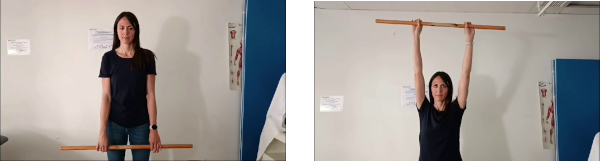 De pie. Con ambas manos cogemos un palo o bastón. Con los codos extendidos subimos los brazos lo máximo posible intentando que no haya diferencias entre ambos brazos. Al final del recorrido mantenemos unos segundos y posteriormente volvemos a la posición inicial.