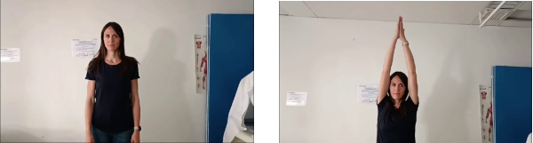 De pie, con los brazos a lo largo del cuerpo. Ponemos los brazos en cruz y manteniendo los codos extendidos subimos los brazos intentando dar una palmada por encima de nuestra cabeza. Mantenemos unos segundos y volvemos a la posición inicial.