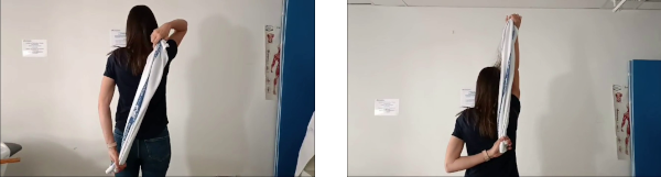 De pie, cogemos una toalla por la espalda, una mano en cada extremo de la toalla. Simulando secarnos la espalda hacemos movimientos ascendentes y descendentes. La mano con más fuerza puede ayudar a la contraria a completar el movimiento tirando de la toalla. En cada movimiento mantendremos la postura unos 5 segundos. Posteriormente cambiaremos la posición de las manos: la mano que cogía la toalla por el extremo inferior ahora la coge por el extremos superior, y viceversa. Así nos aseguraremos de que los dos brazos trabajen todos los movimientos.