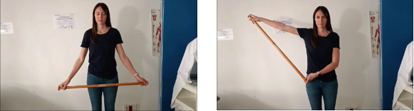De pie, cogiendo un palo con ambas manos por delante del cuerpo. Intentaremos separar el brazo afecto del cuerpo lo máximo posible. El brazo contrario puede ayudar empujando el palo. Al final del recorrido mantenemos unos segundos. Posteriormente volvemos a la posición inicial.