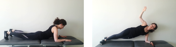 Tumbados de lado con las rodillas dobladas, los pies juntos y el codo doblado a la altura del hombro, elevaremos el tronco manteniendo la alineación de hombros y caderas. Mantenemos 15 segundos y volvemos despacio a la posición de reposo.