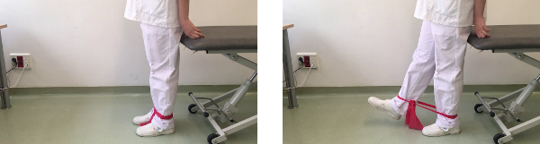 De pie, apoyados en una superficie con las manos. Una banda elástica rodea los dos tobillos, y echamos hacia atrás la pierna a movilizar con la rodilla completamente extendida. Mantenemos la posición 5 segundos y volvemos lentamente después hasta la posición de partida.