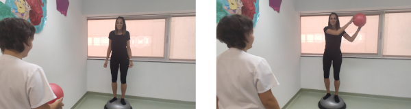 De pie, sobre el bosu. Una vez que hayamos conseguido mantenernos estables, nos lanzarán un balón para cogerlo a distintas alturas. También podemos lanzarlo nosotros mismos contra una pared para que rebote y recogerlo.