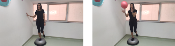 De pie sobre el bosu, nos ponemos a la pata coja sobre la pierna afecta. Una vez que hayamos conseguido mantener el equilibrio nos lanzarán un balón a distintas alturas para recogerlo. También podemos lanzarlo nosotros mismos sobre una pared para que rebote si no hay nadie que nos lo pueda lanzar.