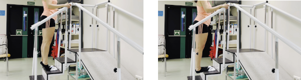 De pie en un escalón, con los talones fuera del mismo. Pondremos una toalla debajo de la parte delantera de los pies. Nos agarramos con las manos a una barandilla. Nos ponemos de puntillas con ayuda de las manos. Esta será la posición de inicio del ejercicio. Desde ahí bajaremos lentamente, dejando caer los talones lo máximo posible y controlando el movimiento. Repetimos.