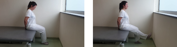Sentados con los pies apoyados y las manos unidas por la espalda, estiramos la pierna afectada llevando la punta del pie hacia el techo y mantenemos la posición durante 5 segundos. Volvemos a la posición de partida mientras bajamos el mentón hacia el pecho, manteniendo la posición también durante 5 segundos. Repetimos este ejecicio 10 veces.