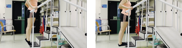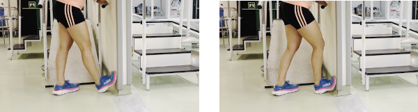 En un peldaño, colocamos más de medio pie fuera del peldaño y el resto dentro del mismo, y el otro pie completamente fuera y sin apoyar. Dejamos caer el peso del cuerpo hacia abajo estirando toda la musculatura posterior de la pierna y consiguiendo una flexión dorsal del tobillo. Elevamos hacia la posición media (no nos ponemos de puntillas) y nos volvemos a dejar caer en vertical en repetidas ocasiones.